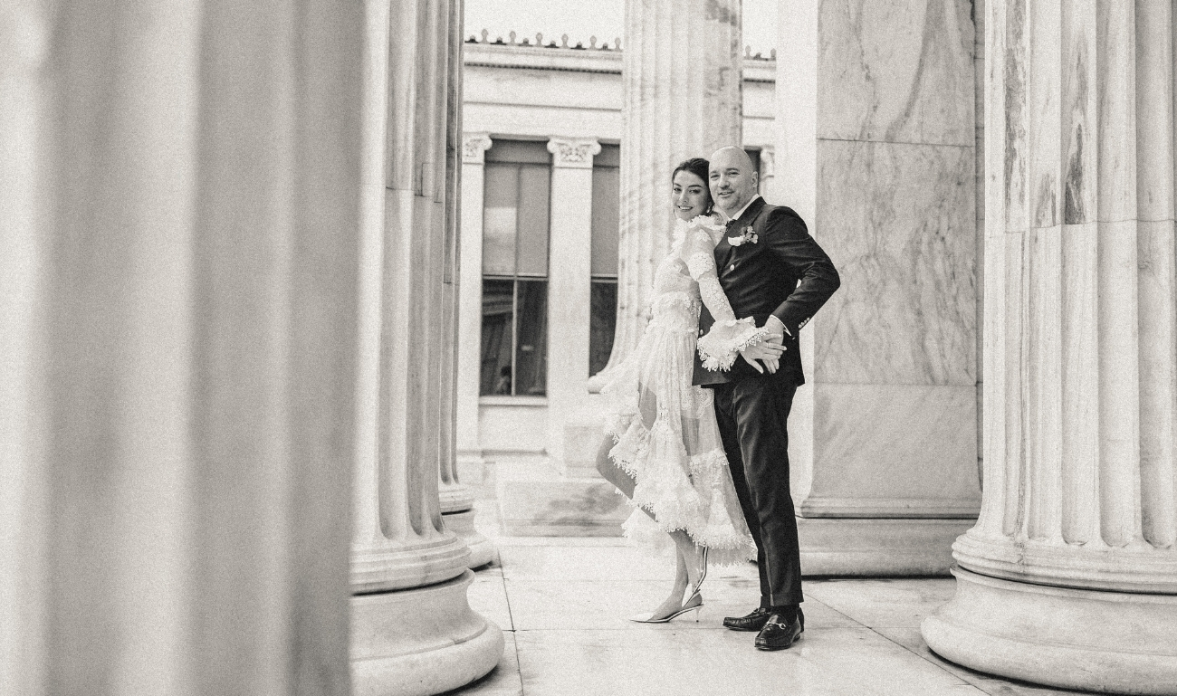 Klasik ve zarif detaylarla tasarlanan bu özel gün, Atina’nın en büyüleyici mekânlarından birinde, tarihi sütunların gölgesinde başladı. Baldan, dantel detaylı, vintage dokunuşlarla süslenmiş gelinliğiyle adeta bir Yunan tanrıçası gibi görünüyordu. Can ise klasik ama güçlü duruşuyla bu büyük anın heyecanını en derinden hissediyordu.